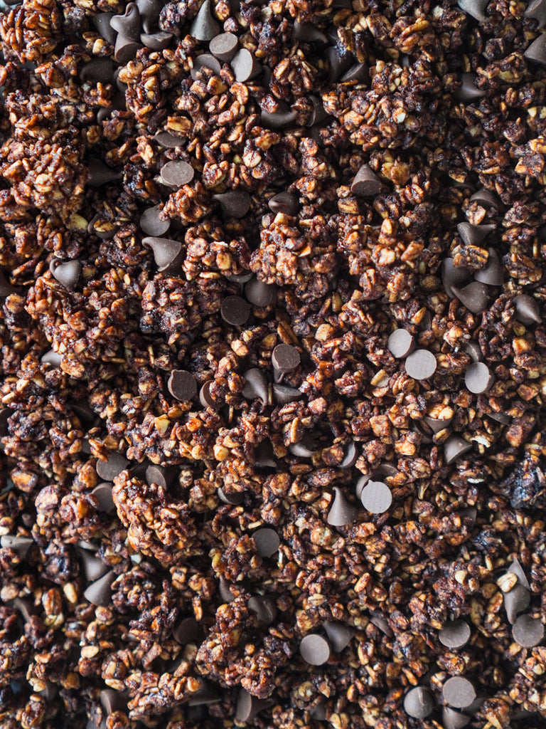 Baked oat clusters with Valrhona cocoa powder, honey and dark chocolate couverture chips.