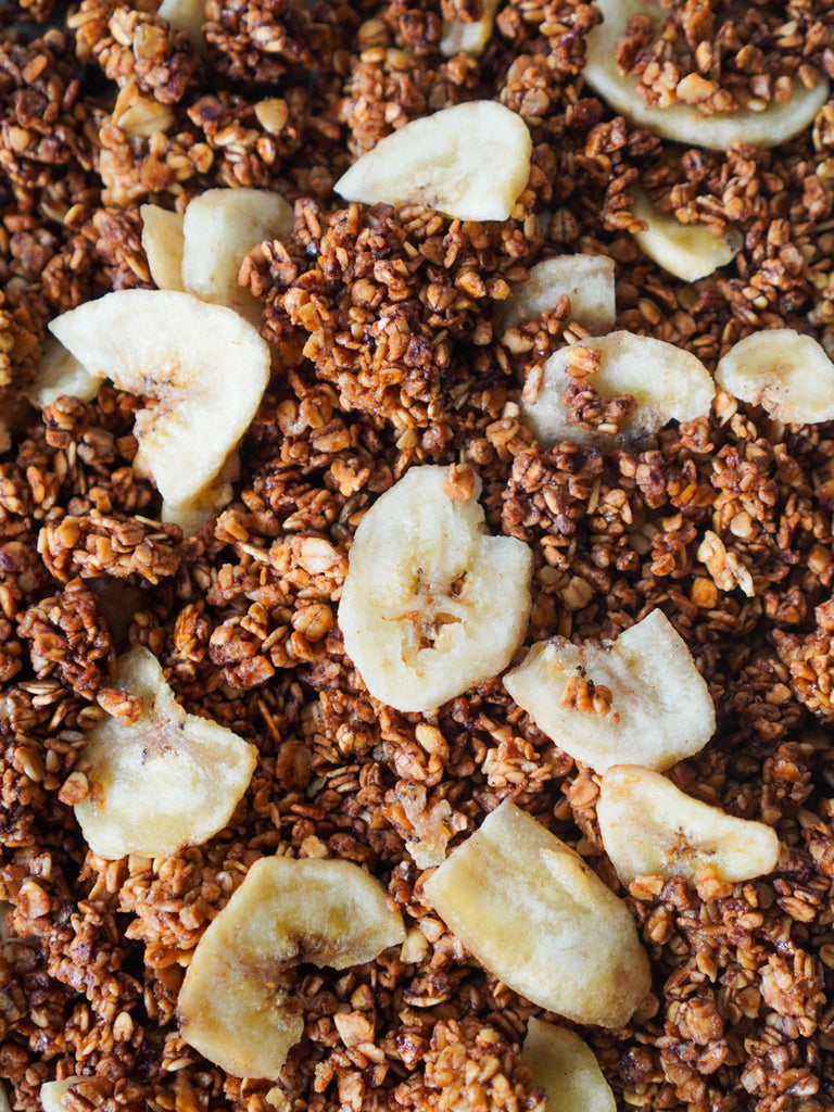 Baked oat clusters with pure maple syrup and dried banana chips.